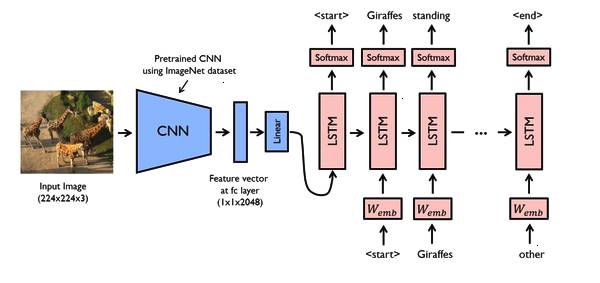 通常,预训练的CNN从输入图像中提取特征。线性变换特征向量以具有与RNN / LSTM网络的输入维度相同的维度。该网络在我们的特征向量上被训练为语言模型。